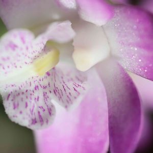 デンドロビウム キンギアヌム 全体の姿・形もいいけれど拡大してみるとまた別の美しさに気づく 花弁の繊細な模様、キラキラの輝きに魅了されてしまう
