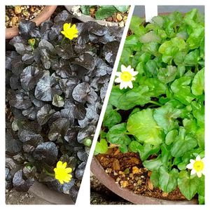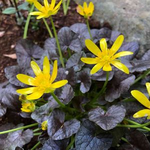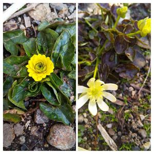 ヒメリュウキンカ🌼 八重咲きと烏葉🌿 両方共3~4年程育てていますが、殆ど増えません。 八重咲きはやっと2株に💛