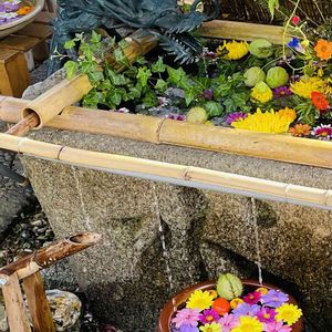 タイトル『花手水と鹿威し』 『はなちょうずとししおどし』 水の音と鹿威しの音しか聞こえませんでした💚💚💚