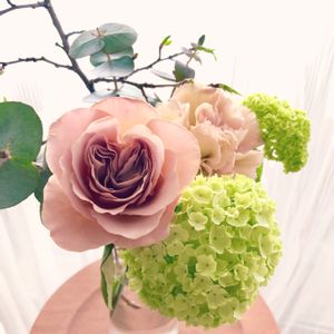 お花の定期便💐 ⭐️スノーボール ⭐️バラ カフェラテ ⭐️カーネーション ロドムアルファ ⭐️ユーカリシルバーダラー 追加で桜枝 今回ブラウン系でお願いしたら、シックで素敵なブーケが届きました💕 繊細なラテカラーの薔薇と、ボリュームのある紫陽花に似たスノーボールの組み合わせがgood(⁎˃ᴗ˂⁎) ♬*゜