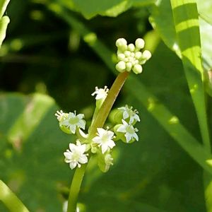 メダカの水槽の中 水生植物 やや短い 緑白色の5弁花をつける 花は直径約2.5mm 団扇銭草(うちわぜにぐさ) 別名ウォーター マッシュルーム ウコギ科