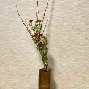 新年を迎える生け花。 みなさん、今年は大変お世話になりました。大切なお正月の花材、 自分の庭の南天に鋏を入れることができて、とても感慨深いものがあります。この地域は寒くて育たないと言われましたが、毎年冬囲いをして大きくなりました。 花器: 🇺🇸製花瓶 花材: 菊、アルストロメリア、 南天、アカメヤナギ、丸葉ルスカス、もみの木