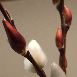 ネコヤナギ (赤目柳) ネコヤナギと ヤマネコヤナギの雑種 枝は陽の当たった方が 赤くなり💟 裏になるところが 緑です💚 赤い片鱗が 剥けると 艶々の 銀色の 🐈ネコちゃんの 毛のような花穂が 出てきます 切り花なので 毎日楽しみに 見ています😊