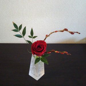 本日のお稽古 生花二種生 先週は花展の為、お稽古はお休みだったので今日が久しぶりのお稽古。 薔薇の葉っぱ🌿難しいなぁ~😃💦
