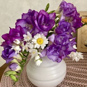こんにちは フリージアを切ったついでに庭の花を生けました♪ フリージアの香りが良い感じです →2枚目は可愛いバコパ シンプルで華やかさはありませんが優しい感じが好きな花🌸