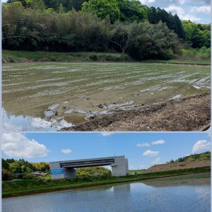 ゴールデンウィーク💚と言えば、毎年🌱🌱田植え🌱🌱 上、山に囲まれた田 下、354号沿い、バイパス通り 川のように、見えますが、稲が植えてあります🌱🌱二ヶ所の田植え、終わり 山沿いは、ウグイス 🐸カエルの合唱 のどかな田舎です😄