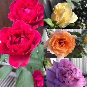 今朝の薔薇達 オデッセイア🌹 ホワイトクリスマス🤍 ブラスバンド🧡 プラムパーフェクト💜 朝夕は少し凌ぎやすい気温に変わって来ましたネ💕 庭も賑やかになって来ました。🌸🌱🌼🌱💠🌱🌹🍃