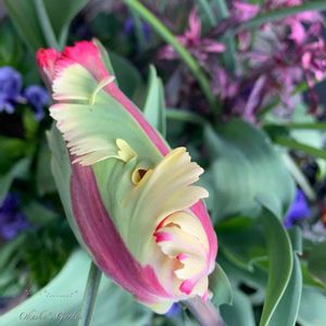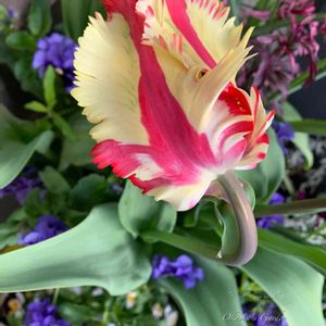 チューリップ エステララインベルト 前回の投稿では紅白のおめでたーい色合いだった子。最後の一輪が咲いています。 思い描いていた通りの、赤・白、緑が上品に混ざり合った、チューリップ狂時代を彷彿とさせる、華やかながら神秘的なお色と花姿。 ジャケ買いしてよかった╰(*´︶`*)╯♡
