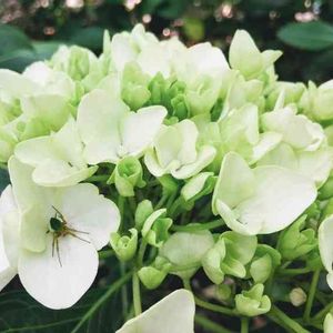 うっすらグリーンのアジサイと 翡翠のようなクモ