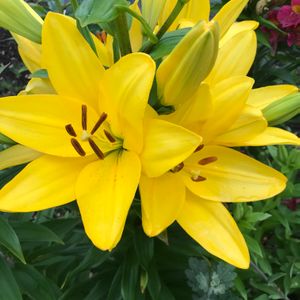 💕この画像😰😱残念💦💕 私の背丈より高い 黄色のスカシユリ、 先日の雨風で 1本倒れ 玄関でペットボトルにさして飾ってます ここに それも立っていたら凄く 豪華で見映え 。。。ほーら バエル?映えるって❣️若い人が この写真は一昨日のです! 今日はもっと咲いてます 向かい側の赤に近いオレンジも 雨が酷いので、外に出ません 右後ろで 白も咲出してます 雨降りだから 咲かなくてもいいのにネ 花びら落ちないといいんだけど 日曜ビタミンカラー♪ ビューティフルサンデー