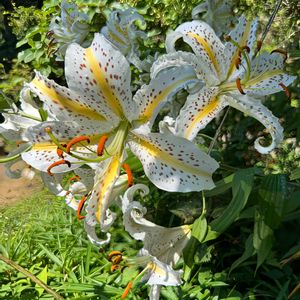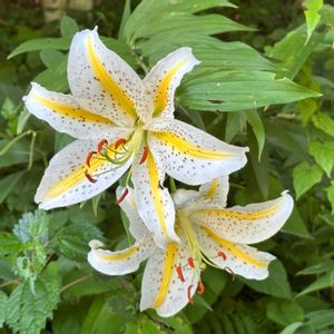 百合の最盛期を迎えてきました🥰 ①ヤマユリ(山百合) 3年振りの開花✨️✨️ 2年続けて猿の被害に💦 今年は初めて3本出てきたものの1本は蕾の頃に茎を虫に食べられていました😓 待ちに待っていた開花です😍 ②③ウバユリ(姥百合) 畑のは今年も猿に手折られ、3〜4年程前から近所に何本か発芽していたのも毎年猿の被害に…😓 こちらも初めての開花姿✨️✨️✨️ 後ろにまだ蕾もありました ヽ(=´▽`=)ノ ④コオニユリ(小鬼百合) 種でアチコチに増えています。 咲き始めました💕💕 鬼百合や鹿の子百合もこれから咲いてきます💓