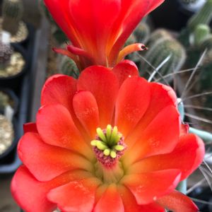 エキノケレウス属のセン刺蝦です。 花の直径約60mmで長さ約80mmです。 濃い橙色です。雌蕊は、黄緑色です。