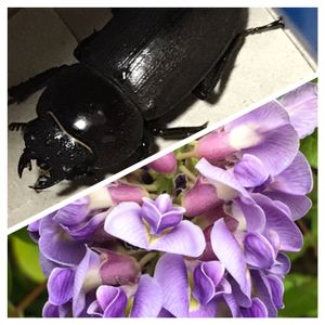 今年はじめてのクワガタ見つけた。 メス 種類は不明 アメリカ藤の花