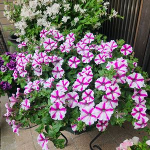 ❇︎台風7号接近中です ❇︎ 猛威を振うと思われていた台風7号。只今最接近と思われますが予想より被害が少なく済みそうです😊 ①PWあふれ咲きペチュニア ラズベリージャム 台風前に撮っておいて良かった😊 この後台風避難の為切り戻しました✂️ひと株でこんなにもりもり育てられたのは今年が初めてです。今季育てているペチュニアの中で1番育てやすいかも❣️ ②サントリーフラワーズ サフィニアフリルのホワイトです☝🏻 昨年花友さんが育てているのを見て今季は絶対に、と決めていた子。 思ったよりギュッとしまった株になっています。八重咲きは雨に当たると汚くなってしまいがちなので気をつけてました。 白の八重咲きなんて絶対可愛いでしょ💕 ③④台風の為、室内避難組です。 倉庫にも10鉢入ってます💦 入りきらなかった子達の無事を願ってます🙏🏻 ⑤おまけの小春🐾 何か視線を感じる?と思ったら、私が庭仕事してるのをじーっと見てました😆 手前のお花はPWさんのスーパーチュニア ラヴィドゥヴィです💕 台風の影響を受けそうな地域にお住まいの方、お気を付けて下さいね😊 近くの川など見に行ってはダメですよ⚠️