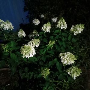 ピラミッド紫陽花 シルバーダラー 1、2枚目 昨夜 玄関の明かりでライトアップ 3、4枚目 今朝