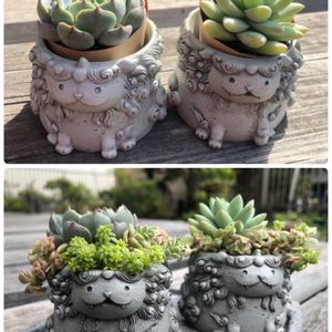写真↑先日衝動買いした シーサーっぽい超ミニ鉢? ↓写真。底穴が無かったので 1センチ程の穴を開けて チマチマ。 アフロシーサーになった🤣