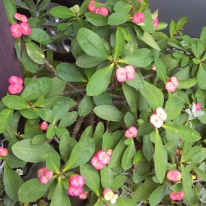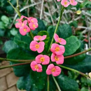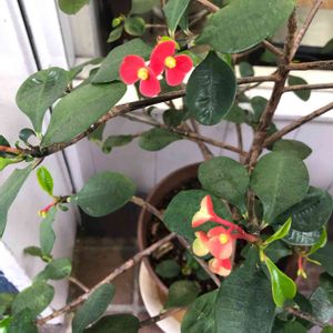 トゲナシハナキリン シャインキッス 冬は家の中 春になると外 一年中お花が咲きます✨ 家の中では 葉の色が悪くなっていましたが 外に出したら 葉の色もきれいになり 赤いお花も咲くようになりました😊