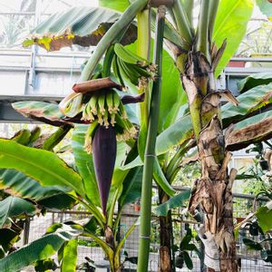 二週間前に温室で見たバナナの木のその後が気になり見に行くと…紫の物体が出現し衝撃的な姿になってました笑‼️ 緑の房の下部にあるのが花のようですが😆