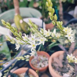 我が家の『亀甲竜』 これまでに4〜5🐢ダメにしてますが… ここGSで何度も耳にしている「亀甲竜は栽培が簡単で」と言う話 羨ましく… いくつも失敗して私がなんとなく感じてきた事 1枚目の2🐢と2枚目の右🐢の様にパカッと割れて固い🐢は安定しがち 2枚目の左🐢と中央🐢の様にまだ割れず柔らかい🐢は気難しい そんな気がします そして3枚目、前から痩せてクチャっとなったけど🌿が枯れず、どうなのか?と思ってた🐢はとうとうこんな状態に この🐢も割れず柔らかい🐢でした ま、これは我が家の🐢に感じた感想ですので…😅 ④『オーニソガラム ヒスピダム』 しばらく前に値下げされてたのを買って来ましたが、こんなに可愛い花が沢山咲いています