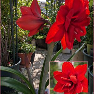 暑い日でした🥵 我が家の💚アマリリス❤️✨ ダブルドラゴン 今年は、2本立ち上がって、その先に2輪づつお花がついて、撮るのが難しく…5枚全部同じアマリリスです😅 5枚目は、もう1輪咲きそうな予感💖
