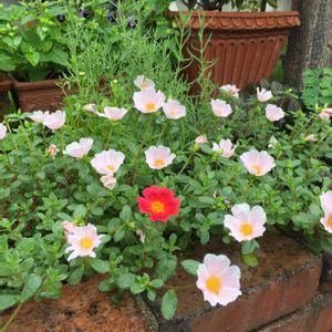 淡いピンク色のポーチュラカを2ヶ月前に苗を1株買って伸びたものをカットしては挿し穂して鉢植え2つと地植えに沢山増やせました🎶💕 突然の赤い花びらにビックリ‼️❤️ 紅一点😅