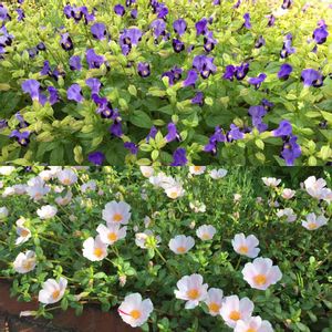 夏に強いトレニア(零れ種より)💜&ポーチュラカ(さし芽)💕 夕方になるとポーチュラカは脱水してやせ細ってます🥵 トレニアは全く動じません!強いです🎵