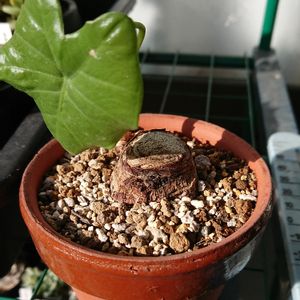 サトイモ科のクワズイモ🎈 ィモの部分が細くなりしぼんできたなと思ったら、中央が腐ってまして、カットしました。😅 上部分のみをとり中央から下部根っこは廃棄。 2日置いて新しい土と鉢に植えこみました。 イモから栄養もらってまた再生してくれるだろうと葉は一枚のみ残し水やりしてます💦😄