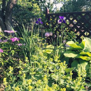 北側花壇は、宿根草の宝箱や〜(古い😅)とばかりにギュウギュウに詰め込んだ宿根草が可愛いお花を見せてくれています。 どうしても諦められなくてまたお迎えしたアストランティアカプリに株分けであちこちで増殖しているアルケミラ・モリス、株分けしたアルケミラ・モリスにくっついてきちゃった斑入りイワミツバなどなど。 庭の入り口アーチの足元では一昨年?実家から分けてもらってきたニワゼキショウとオトメギキョウかな? 株は大きくならず花数も少ないけどどうにか消えずにいてくれてます。