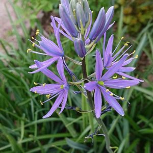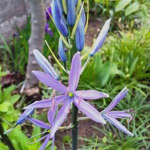 カマッシア ヒアシンス科 花弁が6枚の星形の花が咲き出しました🔯 植えっぱなしの球根から葉だけがあちこちで立ち上がってますが… 花はまだ1茎だけです😭 この涼しげな花色…お気に入りなんです💓