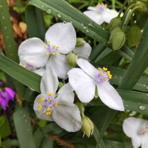 やっと梅雨いりです。 一日花の この白花の 薄紫の蕊の美しさ! 沢山のうつむくツボミは、 準備を整え出番待ち?! オオムラサキツユクサ(白花)