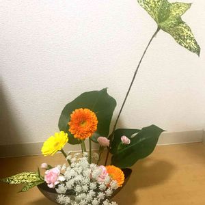 新型コロナの影響でお教室も今日で暫くお休み。エネルギーを感じるオレンジのガーベラとモンテスラを中心に。