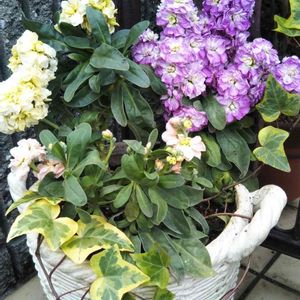 おはようございます☀ ストックの寄せ植えです アイビー絡ませました🌿 良い一日を🤗