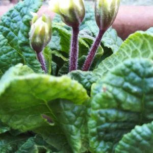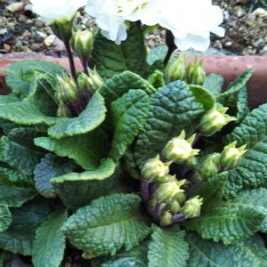 おはようございます☀ プリムラ ベラリーナに蕾が3つ 宿根草なので 何年も 白に薄いピンクのお花です💞 株分けもして増えるし