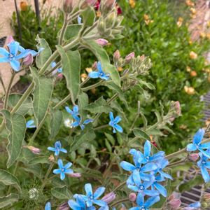 オキシペタラムが咲き始めました✨ 去年の夏に購入して冬越しした株です。 ビオラの淡いブルーと合わせて見ました💙 後ろのオンファロデスは毎年欠かさず種まきしてます。 この花も大好きです🌼