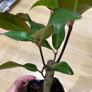 観葉植物♡再燃焼♡ ナマエオボエレマセン。 キロクサセテクダサイ。 葉が2ヶ月前に一度全て落ちた後、復活。点々があるのが気にな〜る。 カシワバゴムノキ。 百均 ¥300