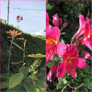 アルストロメリア 電柱と競争してる??? 生け垣の中からこんにちは😊❤️ 朴木より高いよ。 写真がわかりにくいかもしれないですが、左側の写真の上の方にあるアルストロメリアが見えますか? 薄ピンクと、黄色のアルストロメリアもあります。