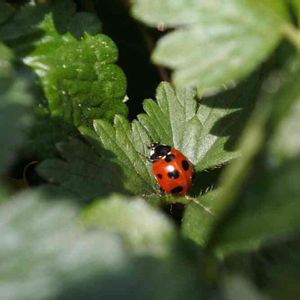 黄色い花が咲くバラ科の 仲間、てんとう虫が かくれんぼ¨ 実と間違えそう。