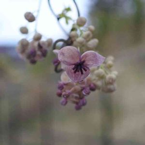 アケビの花が満開 淡い色 美味しい実になるんだよね。