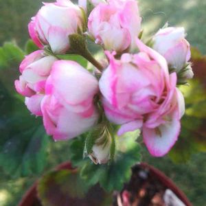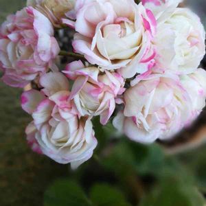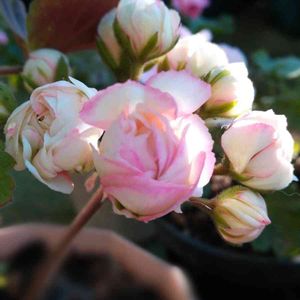 八重咲きゼラニウム・アップルブロッサム(学名: Pelargonium 英名: Pelargonium "Apple Blossom")の花🌸 とても可愛い、八重咲きのゼラニウムです。🌺四季咲き性なので気温さえあれば長期間開花してくれます。🌸🌿薔薇のような豪華な八重咲きで、花房がきれいなボール状にまとまります。💕白い花弁の外側にピンクの縁取りが優しい花です。🌺🪴とっても可愛らしい八重咲きのゼラニウムをお楽しみ下さい。🌸🌿🌺