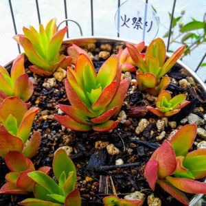 確かダイソーで初めて買った多肉チャン😄 お世話の仕方を知らなくて、ひたすらギュウギュウ詰めになってたのを、少し手入れの仕方を知り、去年やっと解放しました😅 ダイソーから迎えた時は緑1色だったので、名前の『火祭り』の意味がわからず、危なそうな名前だなぁって思ってました💦 だんだんと紅葉して赤くなってからは『火祭り』らしい色になりました😌