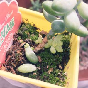 お外でぷりぷり元気でいてくれたけど 台風ですね、まずいですね💦 ところで 右下のアーモンドネックレスらしき この子の側に 謎の多肉が出現しました😳 (ダイソーのタグ横の真ん中に) 最初はブチもなくて 普通に子どもだー増えるんだー✨と 思ったのですが ぷりぷりしてきたと思ったら 謎の黒いブチが出てきて... 病気と思ったけど 伝染る様子もなく共に元気... よく分からないまま様子見💦 違う種類の多肉のようですが...
