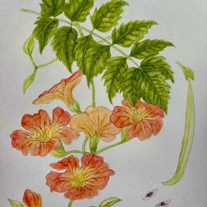 ノウゼンカズラ 透明水彩で描いてみました。 この時季 暑さのせいで作画意欲減退🥵 フウ😮💨 ごめんなさい
