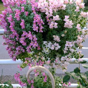 もりもりキンギョソウ🩷 這性・銀葉の金魚草です 去年から育て夏越し冬越し👌 ハンギング2色植え 濃いピンクがシルバーピンク 淡い方がスイートピンク 横からのアップ 下の鉢はたぶん一昨年からのシルバーピンク?