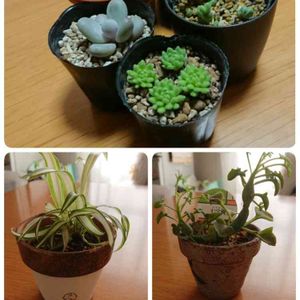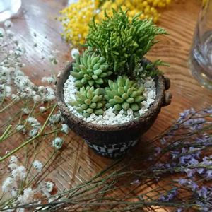 こんにちは🙇☀️⛅ 数ヵ月前に pimirinさん💦の WSでリースを作って来た 時の 小さい苗を 救いたい 一心💕で 鉢に植え替えしました リースも素敵💕でしたが😊 1人の脱落者も出さない事に 集中⚡した為 バランス的には 問題ありですが、これも これで☝️ 可愛い💕~😂もんです😆🎵🎵。 自己満の世界です😊✋