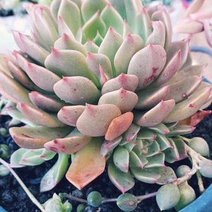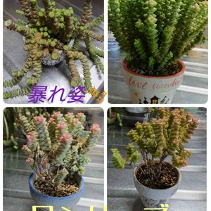 おはようございます🎵 昨年の夏に 思いっきり枯らしてしまったプロリフェラ…💧 庭じゅうの 葉挿しや子芽を かき集めてこのようになりました💓 ピンク色は冷めて 緑色になっちゃったけど 今年は元気です(*´艸`*)💕 マメに水やりして 地面から遠ざけ棚の上に置きました。 夏越えしてくれたらいいなぁ❤️