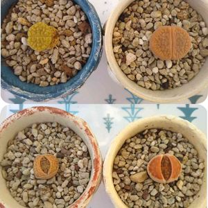 リトープス 1月23日の投稿から約1ヶ月📆 左上は脱皮完了かな⁉️ その隣はジーー、っとしたまま😆(笑) みんなそれぞれ、面白いですよね🎵