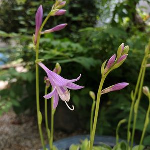 他のギボウシより遅い開花の、斑入りコバノギボウシ🙂↕️🎶 暑さを忘れさせてくれる色合いです✨🩵💜✨ 2枚目は、先日のイワタバコの近くで咲いていたタマアジサイです🫧 久しぶりに見かけて嬉しくなりました🎶