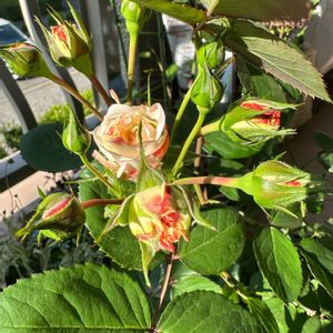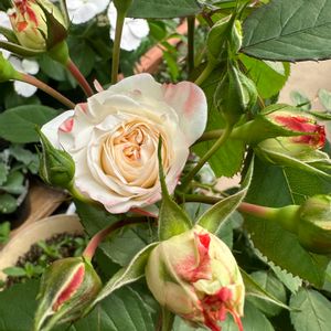 ホワイトピーチオベーション🌹 おはようございます😁🎶 5月12日と16日に投稿したミニバラさんよく咲くので3回目投稿です😊♪ 房咲きで隣の小さな蕾達と並んだ姿が可愛いです☺️🌹このバラも色んな表情があります😌♪