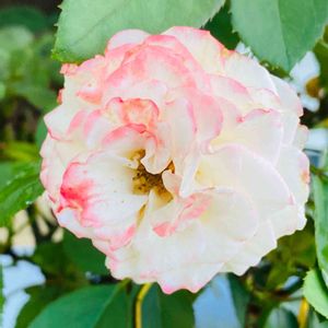 ホワイトピーチオベーション🍑開花♪ オランダ・デルイター社 オベーションシリーズの中でも良く咲き花持ちが良いバラ 四季咲き コンパクト 咲き始めは透明感のあるホワイトにサーモンピンクの覆輪が入るキュート♡なバラ🌹咲き進むと全体が淡いピンクになります💕夏は赤みが強くなるそうです 昨年10月に半額に近いお値段でお迎えしたバラ🌹😆🌹