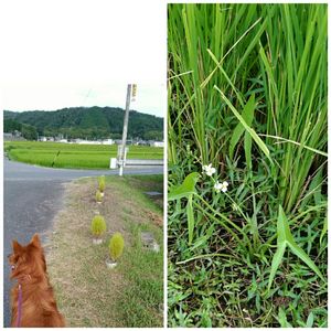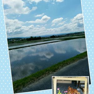 今日の🐕散歩👟👟 水田に雲が映って、綺麗でした🎶 ブーゲンビリアも白くて小さい花をつけています☺️
